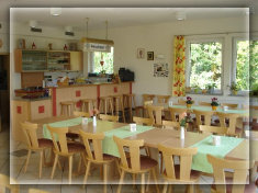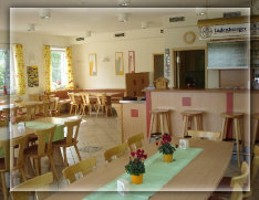 Unser heller, freundlicher Gastraum bietet Platz für 56 Personen. Im Sommer stehen zusätzlich 30 Plätze auf unserer zum Teil überdachten Terrasse zur Verfügung.